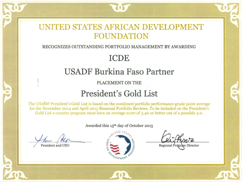 Cabinet d’Ingénierie et de Conseil en Développement d’Entreprises (ICDE) Nos reconnaissances Nous combinons notre passion pour le développement rural depuis 2003 Prix DU PARTENARIAT icde / usadf ICDE, PARTENAIRE GOLD USADF